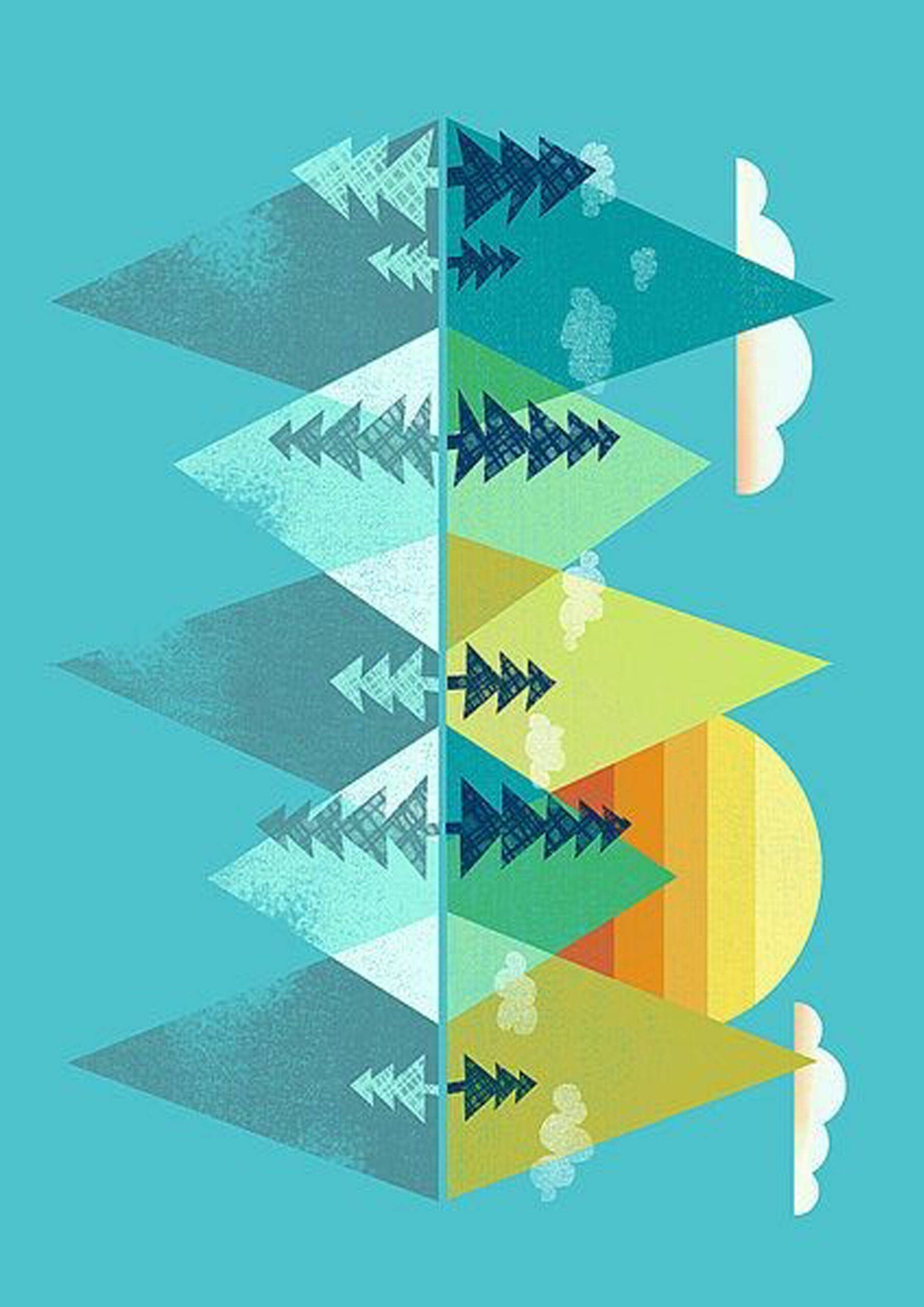 Una interpretación moderna y minimalista de la naturaleza, esta obra geométrica juega con formas triangulares que evocan árboles y montañas, dispuestos simétricamente sobre un fondo azul celeste. A la derecha, un sol naciente en tonos cálidos sugiere el inicio de un nuevo día. Las nubes estilizadas completan esta escena abstracta, ideal para ambientes modernos, oficinas o espacios creativos que buscan una estética limpia, colorida y llena de simbolismo