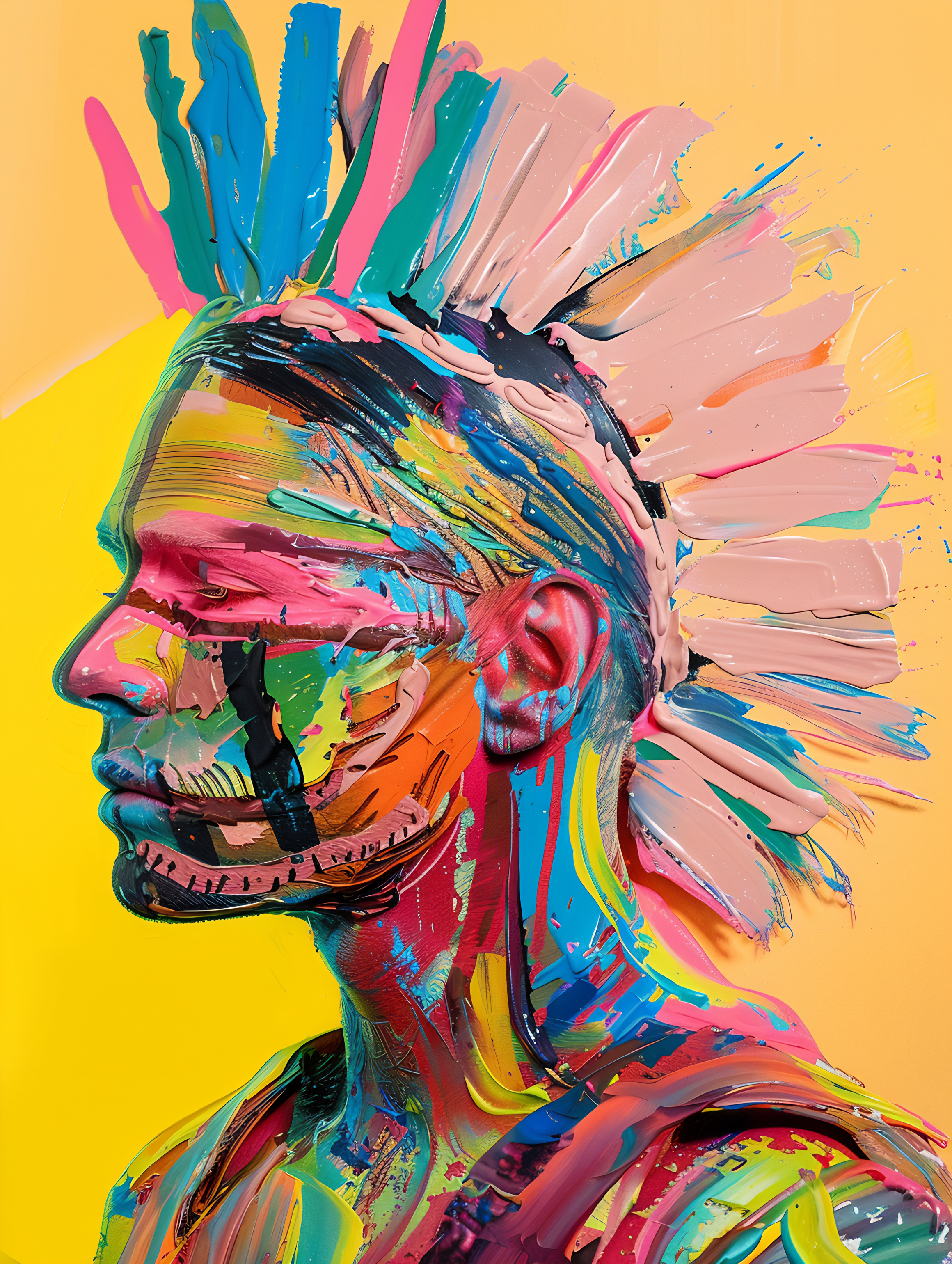 Un retrato de perfil que evoca la figura de un guerrero moderno cuya armadura es el arte. La explosión de color, casi escultural, en su peinado y rostro, recuerda a una fusión entre pintura viva y totemismo ancestral. Es un canto visual a la resistencia, la expresión y la reinvención del ser.