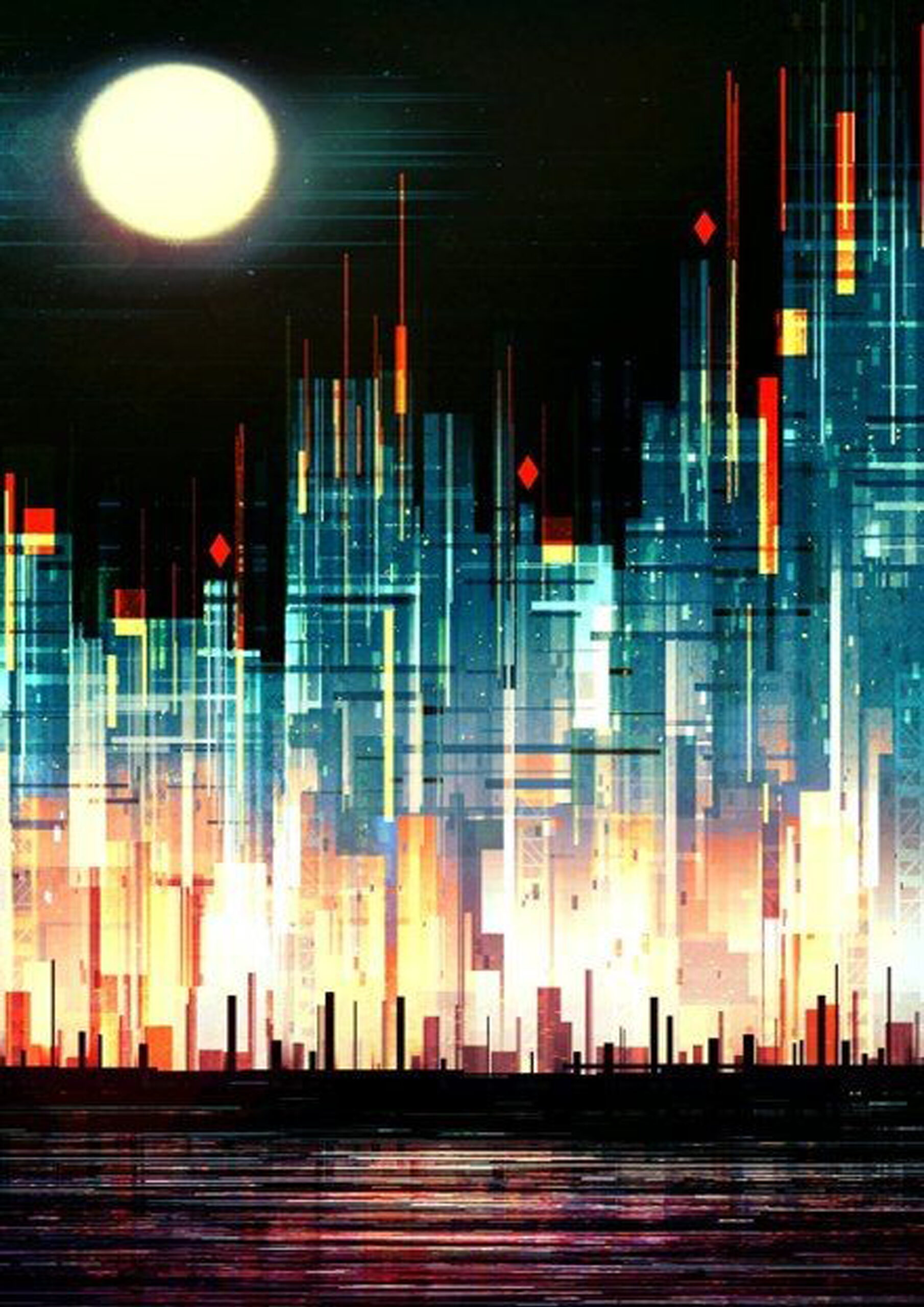 Un cielo nocturno profundo sirve de telón de fondo para una ciudad futurista que brilla con líneas geométricas de azul, cian, rojo y dorado, bajo la mirada de una luna radiante. Las luces de la urbe parecen vibrar, reflejándose en el agua como una sinfonía de energía y modernidad. Esta obra evoca el pulso de una metrópolis del mañana, ideal para espacios que buscan impacto visual y un aire cosmopolita.