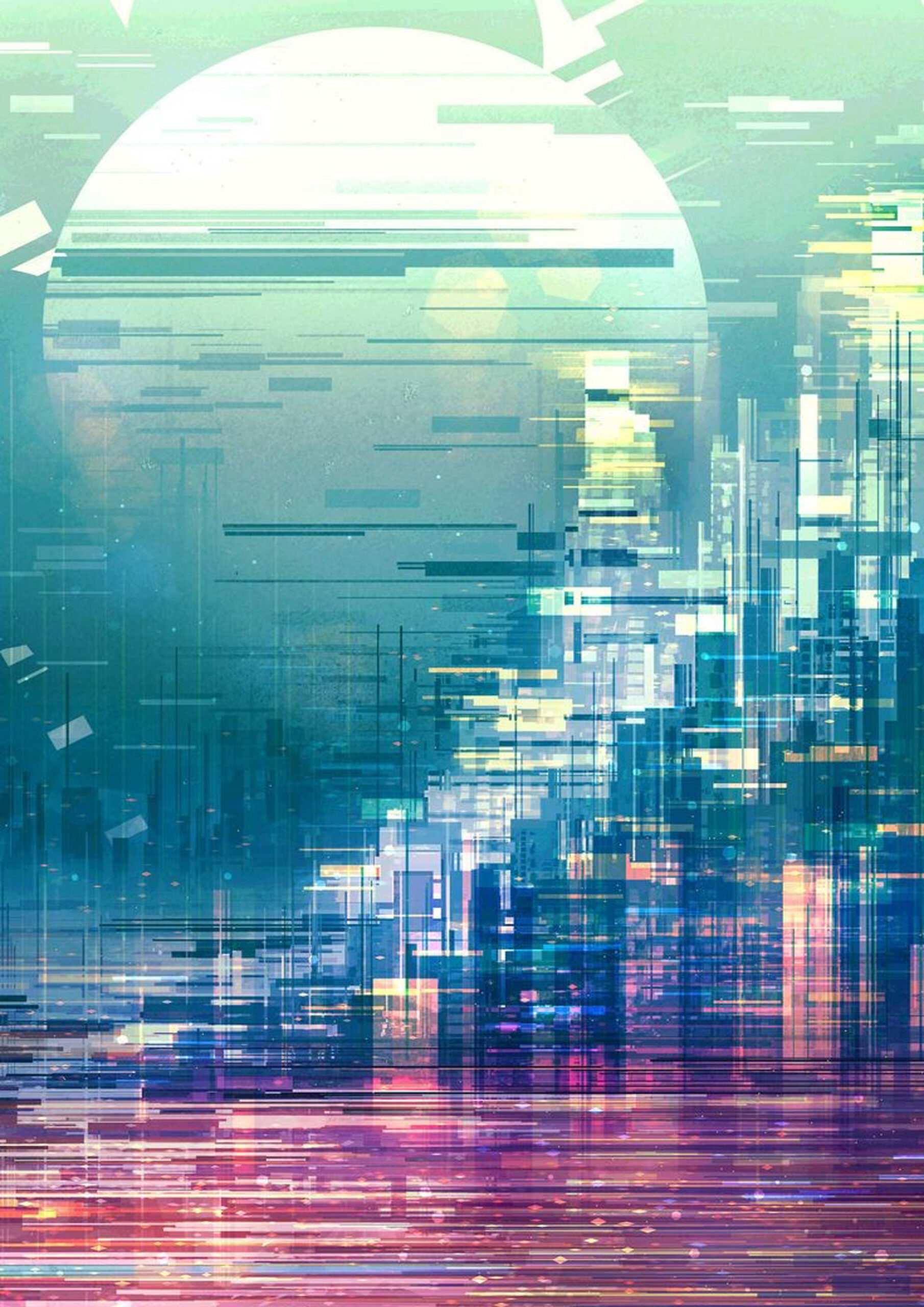 Una metrópolis abstracta se descompone en líneas luminosas y colores vibrantes, bajo un inmenso disco celeste que domina el cielo. El agua refleja la ciudad en una sinfonía de tonos rosados, lilas y azul turquesa, evocando una atmósfera etérea, futurista y serena. Una pieza perfecta para ambientes contemporáneos que buscan modernidad y un aire de ensoñación.